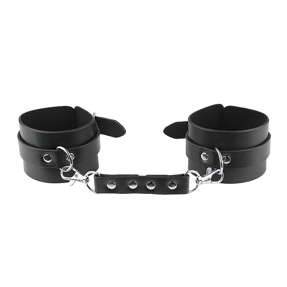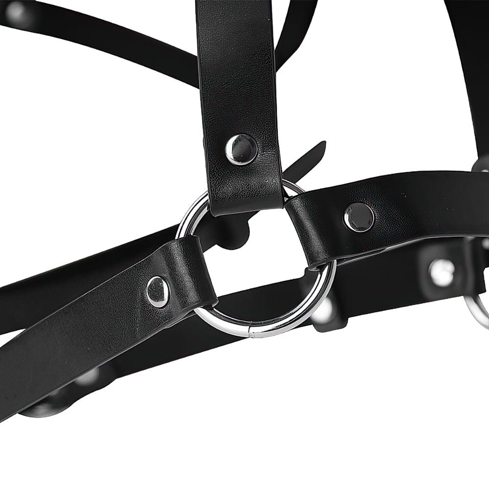 Este dispositivo de restrição é composto por uma combinação sofisticada de couro e acessórios metálicos, projetado para oferecer funcionalidade e estilo. As tiras de couro são interligadas por fechos metálicos, criando uma estrutura complexa e versátil, ideal para uso em cenários específicos.